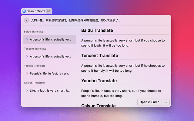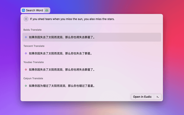 • Support for displaying multiple translation results, currently supports Youdao, Tencent, Baidu and Caiyun translation API.