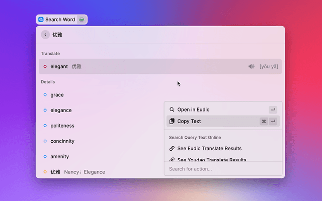 • Support to open the Eudic Application and quickly look up words, if installed on your Mac.