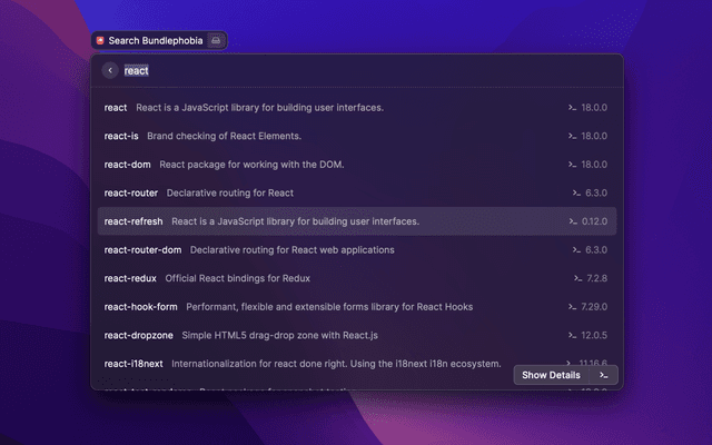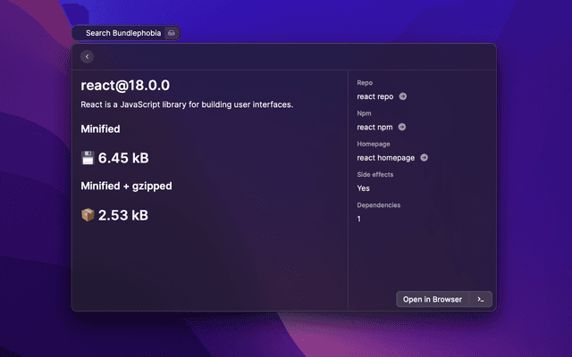 Find package and check its size on bundlephobia